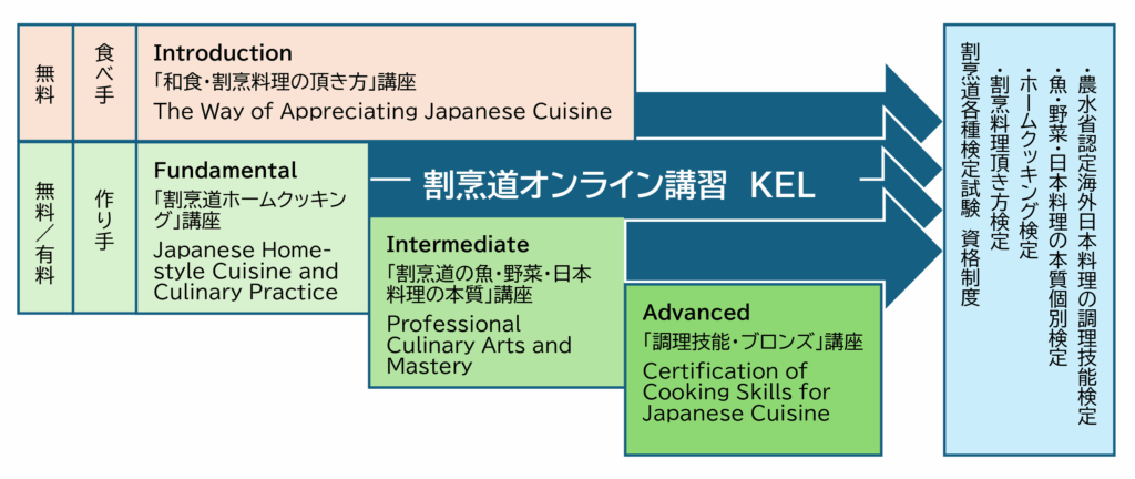 このKELPで取得出来る最高資格であるAdvanced「調理技能・ブロンズ認定」講座・検定に加え、世界の和食ファンを対象にしたOMAKASEの割烹料理の嗜み方を指導するIntroduction「割烹料理の頂き方」講座・検定、ご自宅でも和食を手作り出来るレベルに育てるFundamental「割烹道のホームクッキング」講座・検定、プロフェッショナルレベルの調理技術、日本料理の本質的を習得するIntermediate 「割烹道の魚・野菜・日本料理の本質」講座・検定も同時開講いたします。日本人、世界の和食ファンを対象に健康的な和食、OMAKASEの割烹料理の世界を「食べ手」から家庭のプロの「作り手」までを育てて行きます。