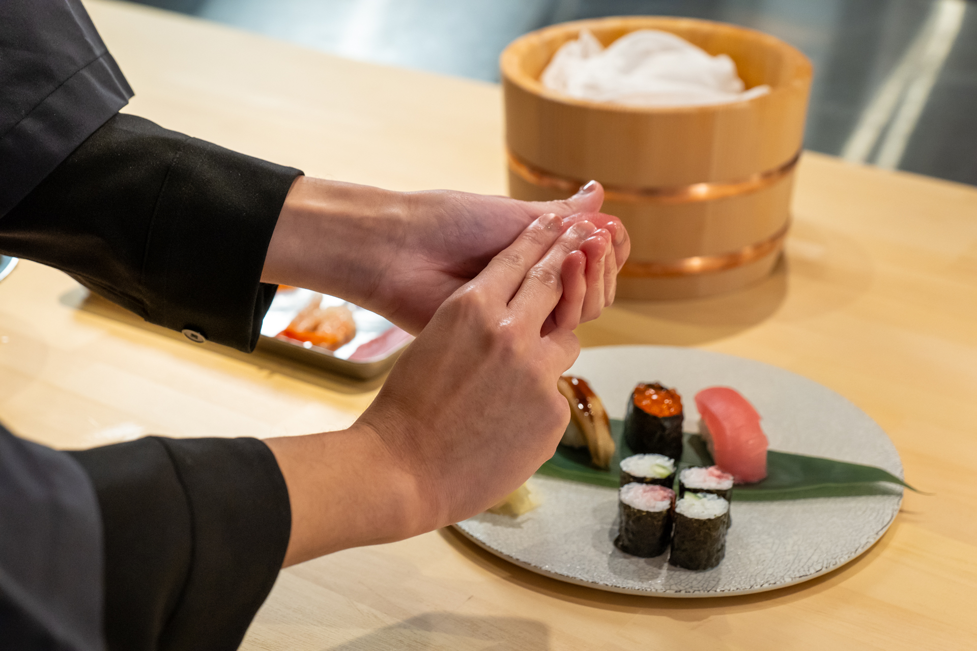 His style of making sushi is the process fewer steps as possible to reduce contacting fish so that the sushi made with "Neta: fish piece" could stay fresh as it can be.